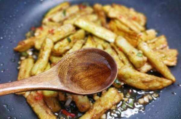 5、鍋內倒寬油加熱,等油稍微冒煙,五成熱後下入茄條炸制,稍高的油溫會令下鍋後的茄條立馬定型,這時要勤翻動以免炸過頭,等炸到顏色微黃後控油撈出。高油溫炸茄條也是茄條吸油少的關鍵,隻是要註意火候的掌控,不要炸糊。
