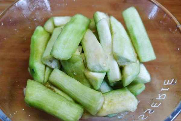 2、長茄子用水沖洗幹凈外皮,用刀切掉頭尾,再用刮皮刀削去外皮,分割成小段,切成小條裝入碗中,最後均勻的撒上一層食鹽,醃制10分鐘左右。食鹽可以醃制出茄條中的水分,除瞭防止本身氧化變色以外,還可以減少油炸時對油脂的吸收。