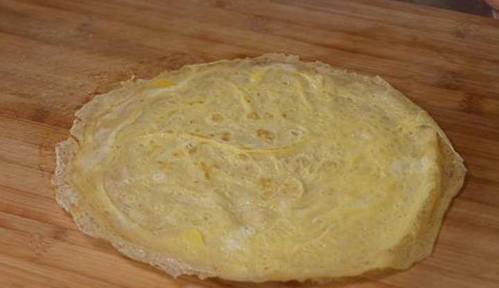 在碗中打上8個雞蛋攪散,再加上點淀粉水攪拌一下,在平底鍋裡刷上一層油,把雞蛋液倒進去攤成蛋皮,8個雞蛋,我攤瞭6張蛋皮,下面把蛋皮鋪在案板上,把餡料放在鋪在蛋皮的一端,然後折疊起來,改刀切成梯形,在梯形寬的一面劃幾刀。