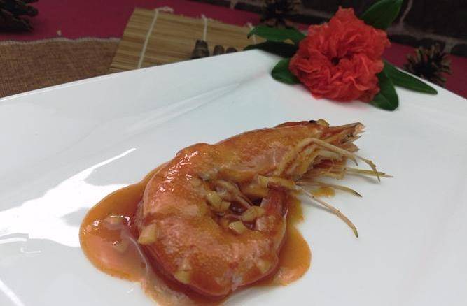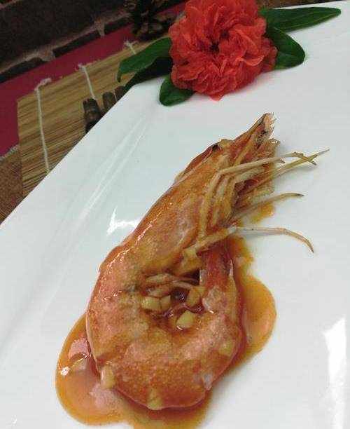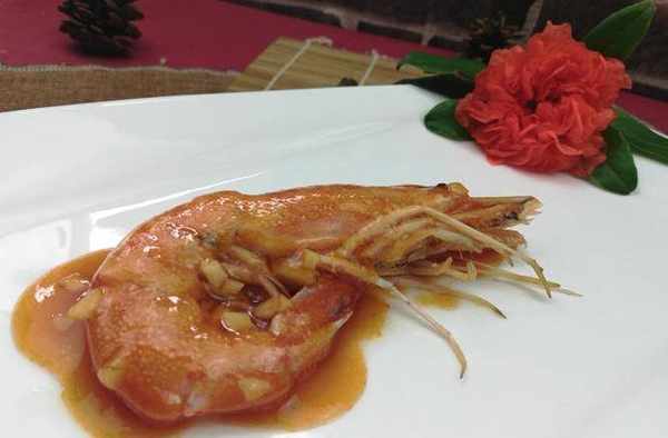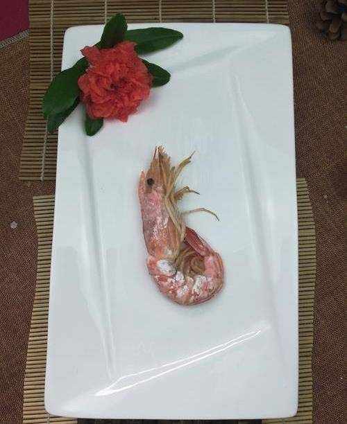 3、本菜品可以上位餐個吃,把煮好的大蝦擺入個吃盤內,周圍適當裝飾。