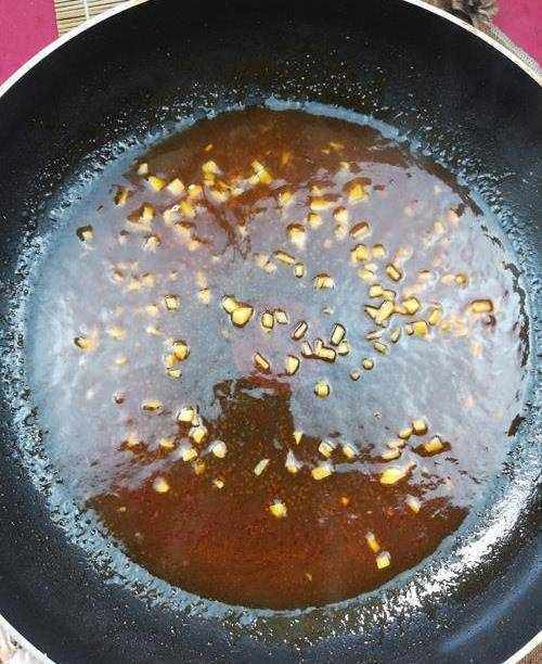 4、鍋內倒入適量植物油,開小火,下入蒜米炒出蒜香。倒入番茄醬,小火炒出紅油,調入白糖、白醋、鹽、適量水,燒至湯汁濃稠,水淀粉勾芡,淋少量明油使湯汁明亮。