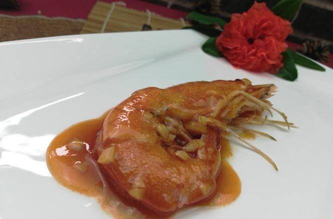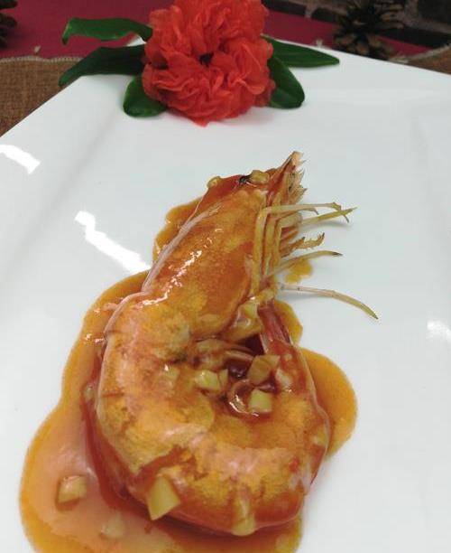 5、把熬好的翻茄汁均勻淋在大蝦表面。