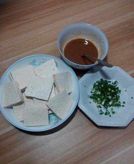 把豆腐切厚塊,麻將大小吧。我隻有半塊豆腐,怕切出來沒幾塊兒,所以切的不厚不薄的片,將就看吧各位~小蔥去根洗凈切蔥花;把糖,醋,適量鹽,生抽,淀粉調成汁水,要加番茄醬也現在調進碗裡。糖醋沒有比例,喜歡甜點的就多加些糖,喜歡酸點的就多加點醋和番茄醬;鹽視個人口味酌情添加;淀粉薄芡就好。