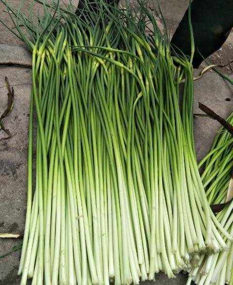 2、蒜薹去除頭上的帽子,洗幹凈備用。臘肉跟蒜苗、蒜薹搭配是最好吃的,也可以用青椒、包菜等等去炒。