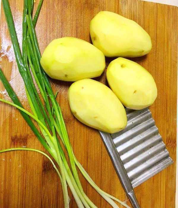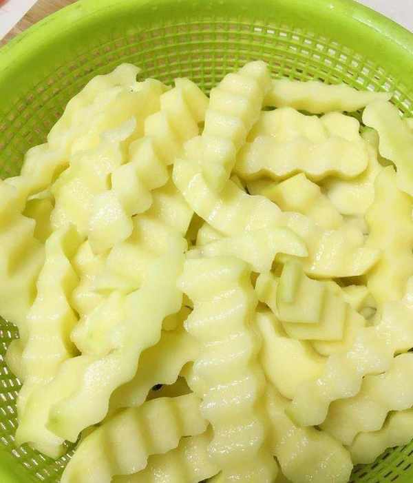 用花刀切小後清水沖一下,把表面的淀粉沖掉,(因為今天我炸的是脆的狼牙土豆)註意這個到沒有平時傢用的菜刀好用,不要切到手。沒有這個刀用傢用菜刀切也一樣,條狀或者厚點的塊狀。