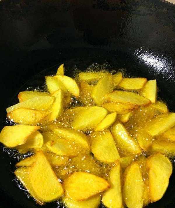 保持大火,因為油溫高,土豆倒進去大概2到3分鐘就完全熟瞭,要吃脆的就可以撈起來瞭,(如果要吃鍋巴土豆的時間要長點,表面還沒有鍋巴的時候不要用鍋鏟去翻,貼著鍋推,不然土豆會爛成小塊,看著表面金黃瞭就要轉中火瞭,預防外面糊掉)。