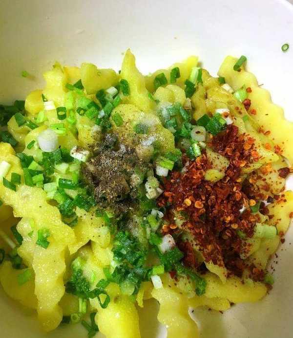 四川的狼牙土豆有很多口味,糖醋麻辣,酸辣,香辣,麻辣,糖醋,……我今天做的是酸辣,加入的調料有米醋,鹽,辣椒面,小蔥,花椒粉,生抽。可以根據自己喜歡的口味加入調料。