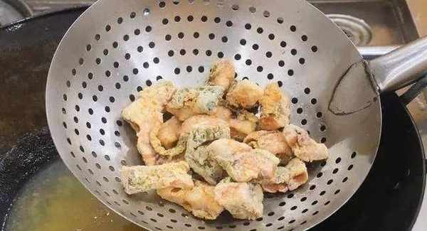 那麼這個時候呢,我們準備一個炒鍋在炒鍋裡面多放一些油,咱們等到油溫達到五六成熱的時候呢,把我們準備好的魚塊放進去炸一下,那到時候,大傢一定要記得油溫不要太高,魚塊炸成黃色就可以撈出瞭,接下來呢,我們把油燒到稍微再熱一點,然後把魚塊倒進去重新再爆炸一遍。等到炸到兩面金黃瞭,我們就可以把魚塊撈出來瞭,這樣炸出來的魚塊呢,可以說也是酥脆可口,非常的美味。