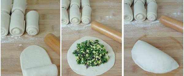 8.取一個小面卷,搟開成餃子皮一樣的圓形薄面片,上面放一大勺韭菜餡。