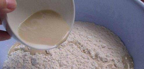 2、將水倒入到面粉當中,然後加入食鹽,攪拌成柳絮狀之後,再將其揉成面團,反復揉搓至表面光滑。