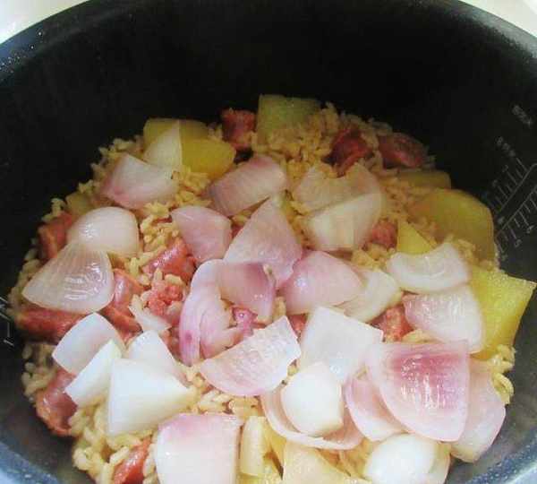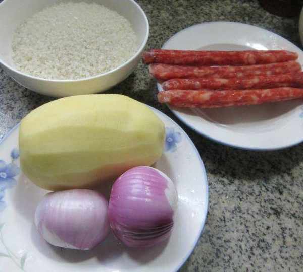 原料:大米、香腸、土豆、洋蔥、醬油、蠔油、鹽。
