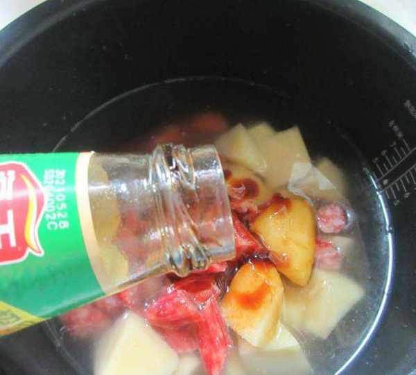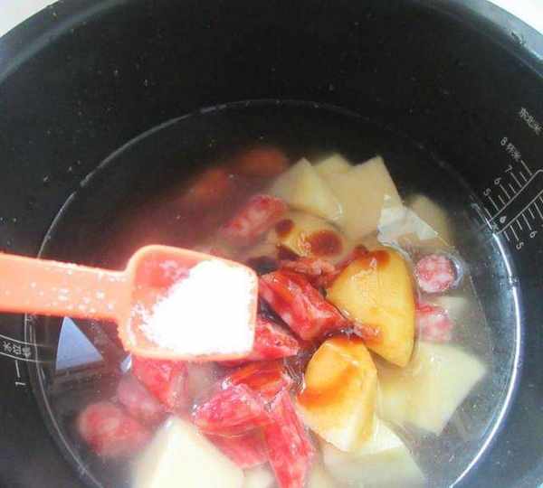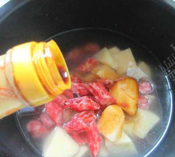 第5步、接著,合入切好的土豆和香腸,加適量的醬油。