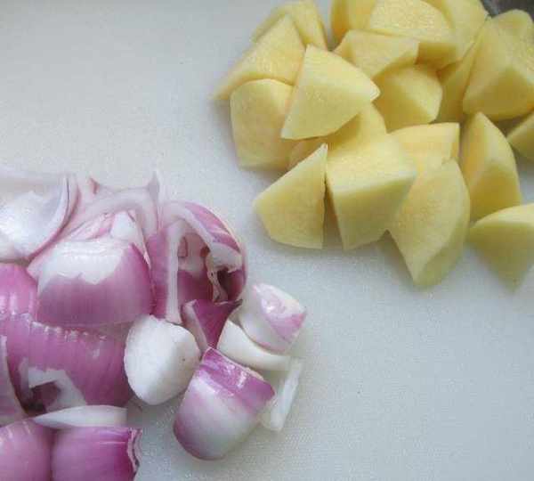 第3步、將土豆和洋蔥放在案板上分別切開。