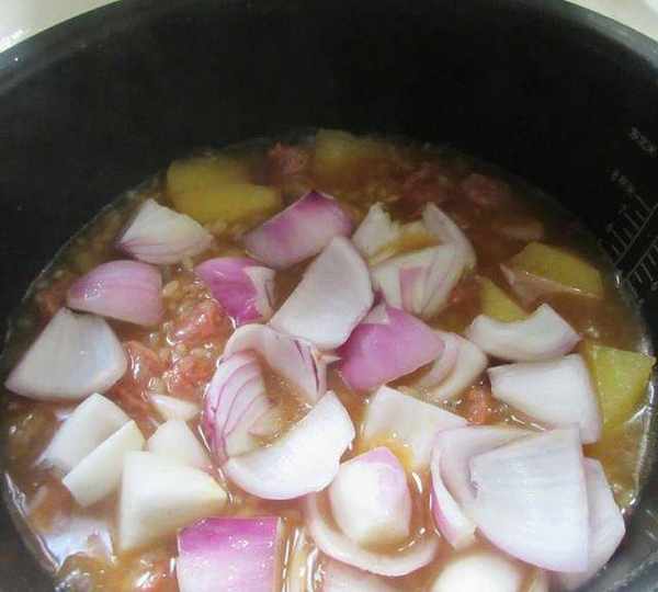 第10步、然後,離燜煮還有20分鐘時開蓋合入切好的洋蔥。