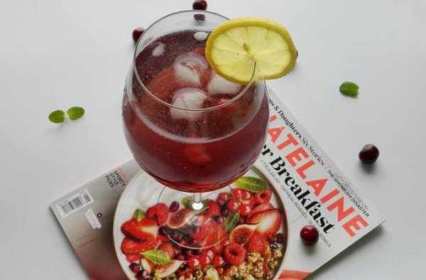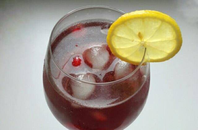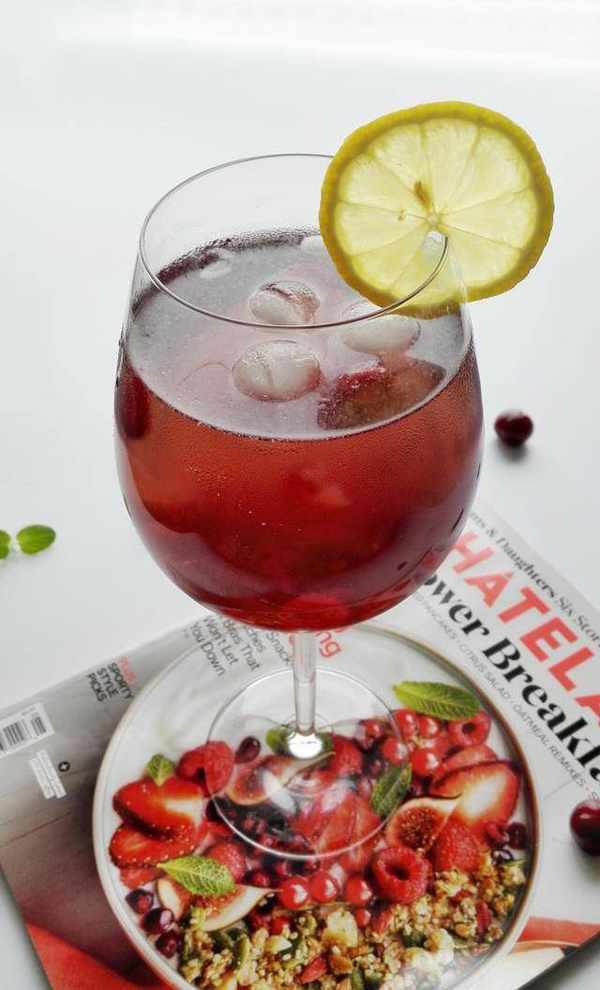 飲品中還添加瞭蘇打水,蘇打水屬於弱堿性水,其中的碳酸氫鈉能中和胃酸、強化腸胃吸收、健胃,並且有助於緩解消化不良和便秘癥狀。蘇打水還有抗氧化作用,能預防皮膚老化。檸檬的加入有助於增進食欲、預防皮膚老化、美容養顏。紅酒對心腦血管有好處。而且蔓越莓熱量很低,所以這款飲料真是非常適合女性的排毒養顏美容的最佳飲品!