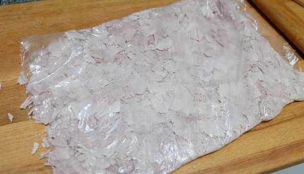 5、用搟面杖敲打一會兒,打的扁扁的,可以使勁敲;