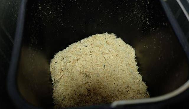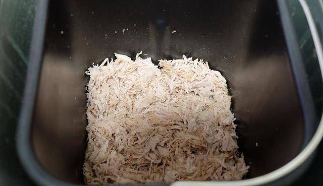 6、敲打後的肉肉用手抓散,很容易就散開瞭,然後放進面包機內桶裡,倒進一大勺的生抽醬油和一小勺的白砂糖,用面包機的“果醬”功能進行制作。(如果有肉松功能就直接用肉松功能,我這個面包機沒有,所以用的果醬功能。如果沒有面包機,也可以用炒鍋小火翻炒,但會很費時間,累胳膊)