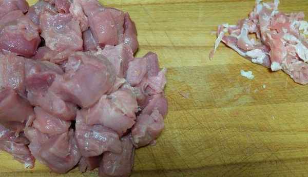 2、將豬肉上的白色的筋膜剔掉,然後切成小塊;