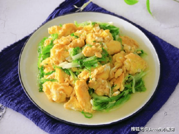 接著倒入苦菊翻炒,炒到微微打蔫,再倒入雞蛋翻炒均勻。