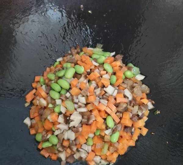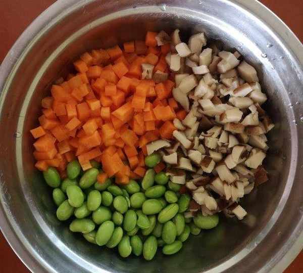 第3步、胡蘿卜切丁、青豆過水,香菇過水煮透切丁。