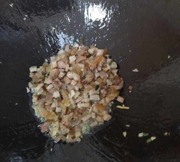 第5步、熱鍋冷油,薑蒜蔥爆香,加入臘肉定。