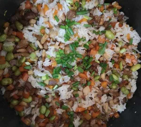 原料:臘肉、胡蘿卜、青豆、香菇、蔥、鹽、薑、蒜、生抽、老抽、蠔油。