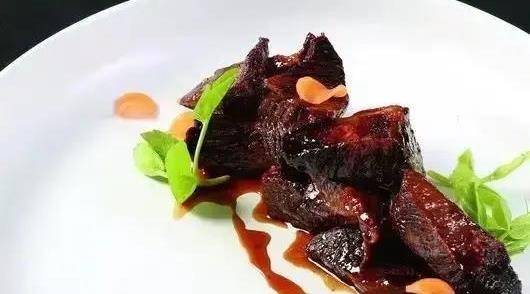 走菜時將牛肉塊下入六成熱油炸定型,撈出後升高油溫至八成熱,再下牛肉復炸30秒至外焦脆內多汁。