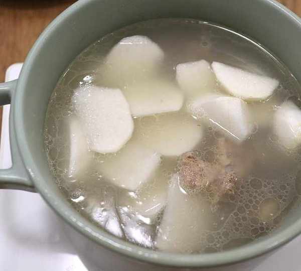 第5步、將白蘿卜入腔骨湯中,蓋蓋子,小火燜燉15分鐘左右,根據蘿卜塊的大小調整時間。