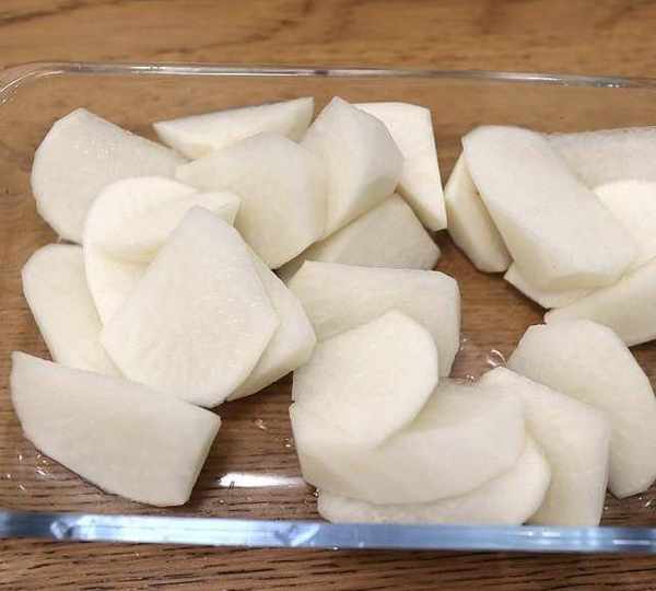 第4步、白蘿卜削皮,入鍋前切滾刀塊;不要提前切,防止切面處變幹、口感發苦。