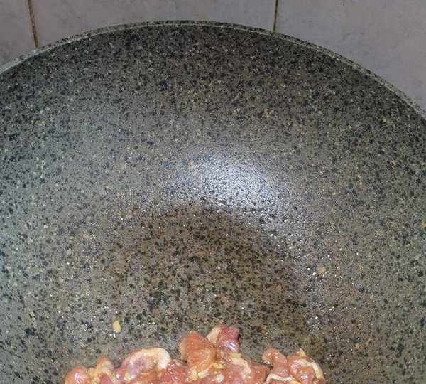 第4步、熱鍋放油,放入醃制好的肉片。
