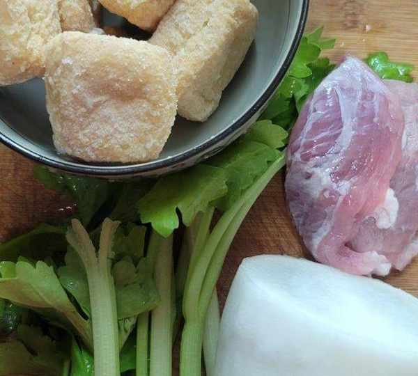 原料:白蘿卜、肉片、油豆腐、芹菜、蒜末、油、鹽、醃料:、醬油、胡椒粉、糖、生粉、花生油。