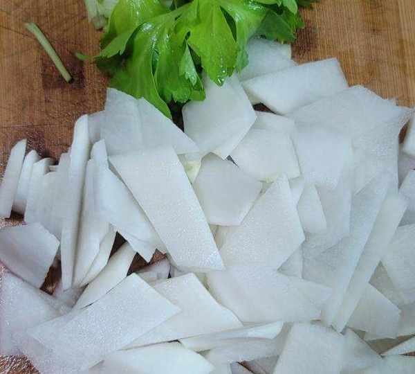 第3步、白蘿卜切片,芹菜切段備用,切點蒜末油豆腐對半切,沒拍到。