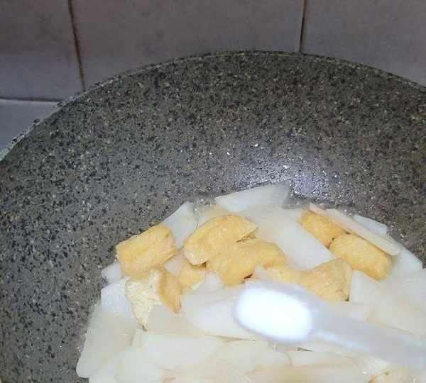 第7步、放入白蘿卜炒一下,差不多炒至斷生。