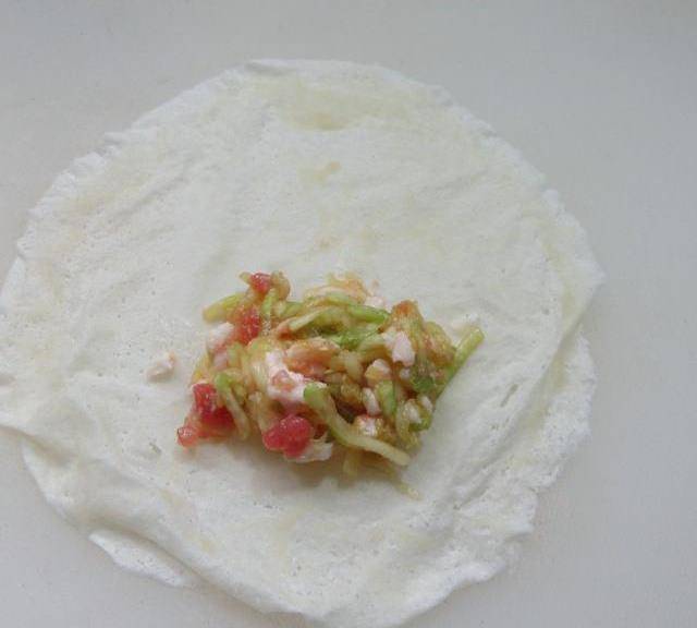 第12步、然後,取春卷皮放在案板上擱上拌好的肉末西葫蘆餡料。