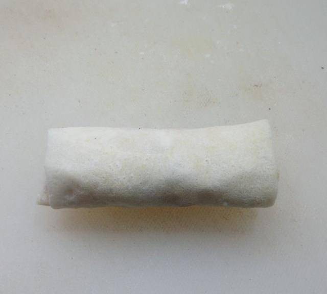 第13步、先兩邊折過來,再從下向上把春卷皮卷起來,在最上面的收口處,抹一點面糊,讓他粘住,成形的春卷。