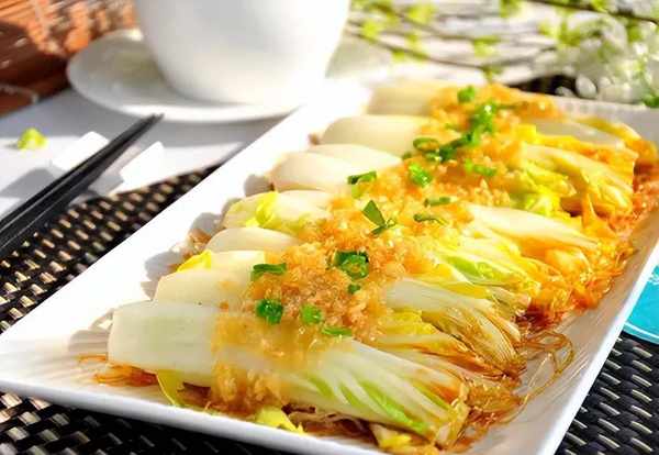 5、找一個幹凈的盤子,先鋪上一層我們提前泡好的粉絲,再將切好的娃娃菜平鋪在粉絲的上面,淋上我們煮好的蒜蓉醬汁。