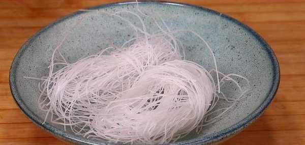 3、將準備好的粉絲放到一個大碗中,然後加入滾燙的開水浸泡10分鐘。粉絲浸泡上瞭之後咱們再向碗中打入三個雞蛋,並將它們充分攪拌一下,起鍋燒油,倒入雞蛋炒熟,炒熟之後裝碗待用,雞蛋要炒成碎一點的雞蛋小塊。