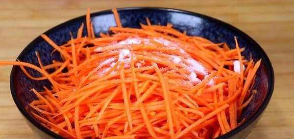 2、先將準備好的胡蘿卜清洗幹凈,去掉外皮,然後切頭去尾,接著將它擦成細絲,把擦好的胡蘿卜細絲放到一個大碗中,然後放上適量的食用鹽充分攪拌均勻,攪勻之後放到一旁醃制5分鐘。胡蘿卜已經處理好瞭,接下來再來處理一下粉絲。