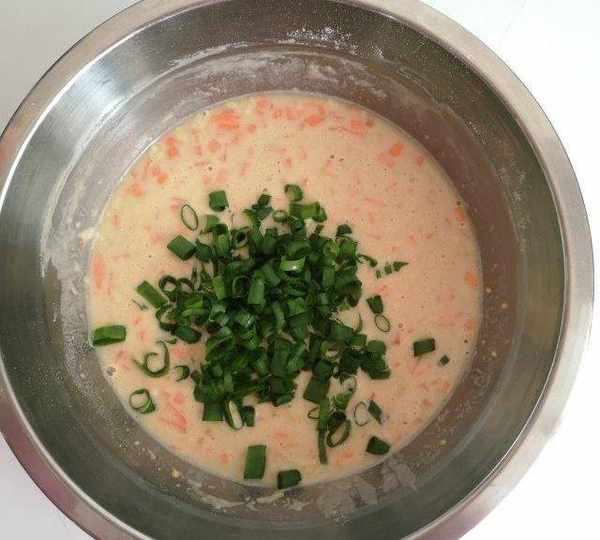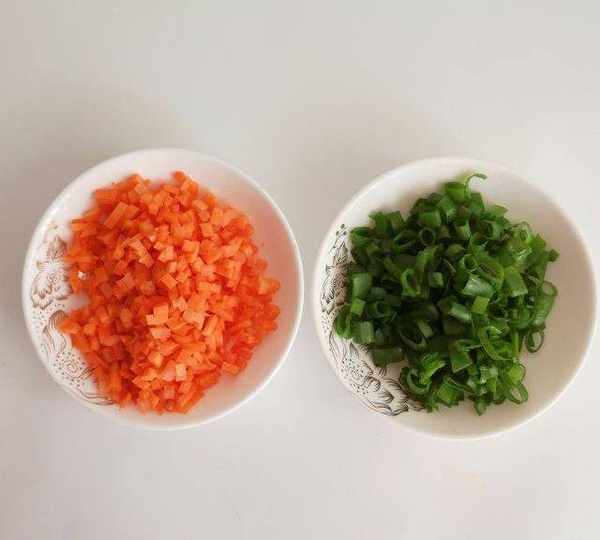 第2步、胡蘿卜洗凈去皮切小丁,小蔥切碎。