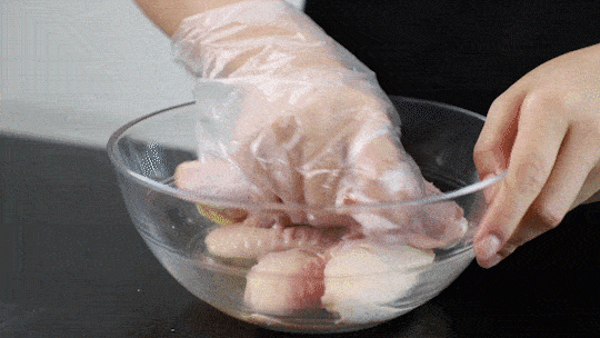 劃好的雞翅加入料酒、鹽、薑片,抓勻醃制15分鐘。