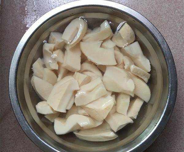 接著我們準備酸筍和泡椒。在煮肥腸的期間,我們可以先把酸筍清洗幹凈,切成小塊,接著將它放在清水中浸泡上一段時間。