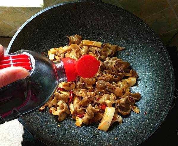 然後我們將切好的酸筍放在鍋中炒出酸筍味的時候,再淋入一些生抽翻炒均勻上色。