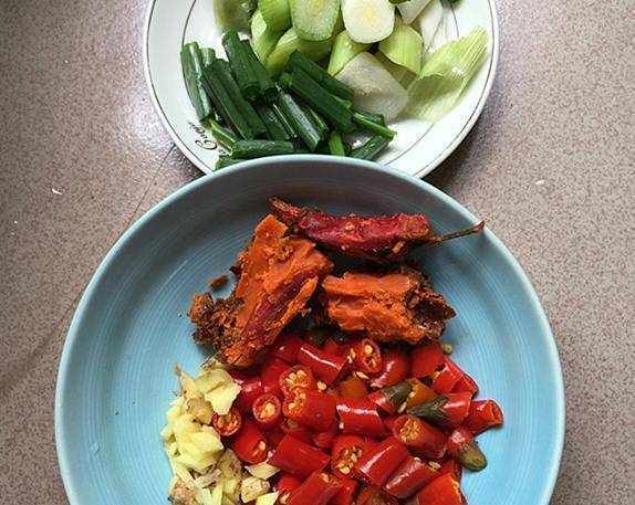 把泡腳生薑全部都清洗幹凈之後切碎,牛油火鍋料我們也準備好,把大蔥和大蒜切成小段。