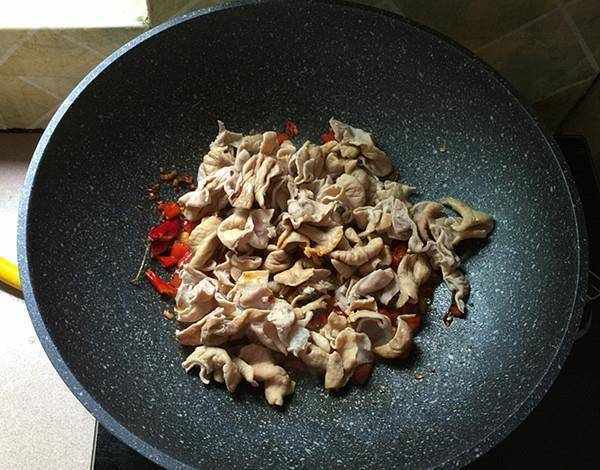 接著在炒鍋中加入適量的油,然後我們把薑泡椒和牛油火鍋料放在鍋中進行翻炒,炒出紅油之後我們再將清洗幹凈的肥腸放在鍋中快速的進行翻炒。