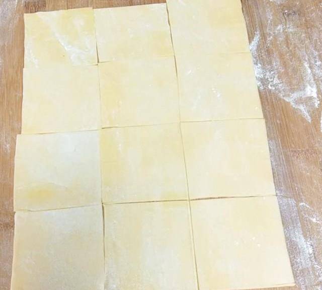 第5步、將面團搟成均勻的薄片狀,切割成7cmⅹ7cm的正方型餛飩皮。