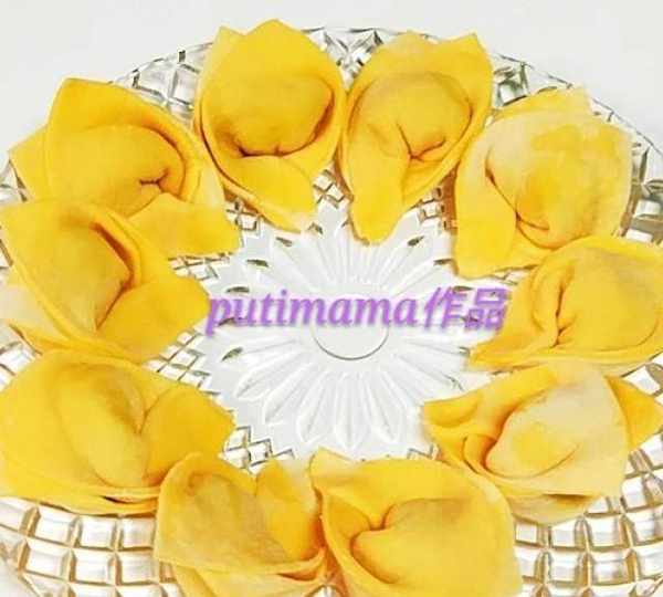 第7步、取1張餛飩皮包入餡料,斜對角但不對齊,稍差開成兩個小三角,然後再將兩側收攏在一起重疊即可,也定比較簡單的包法而已。