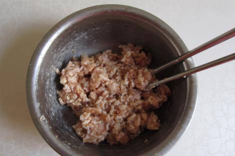 第二步:攪拌好的肉餡,取出一點點來,用手捏成圓圓的餅子。最好在做的時候,戴一副一次性手套會比較好,因為這樣既衛生,又不會讓手很油膩。