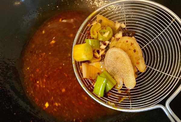 2以火鍋底料和老幹媽做湯底以後,要撈出雜質,保證口感,菜品幹凈。
