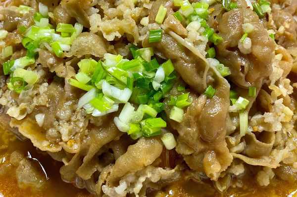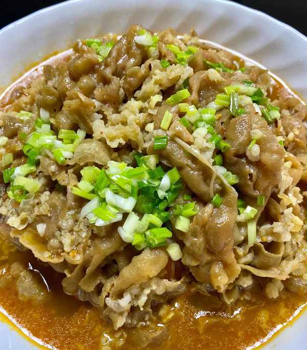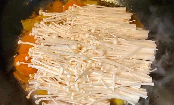 這個菜就是用火鍋底料做湯底,加上老幹媽炒出香味,放入胡蘿卜和土豆片,煮熟後放入金針菇和涮好的牛肉,因為土豆含有淀粉,所以湯汁會起到勾芡的效果,當金針菇和肥牛拖著像勾芡過的湯汁,鮮香麻辣,口感清脆,胡蘿卜吃著有點甜,可以改善一下口中的味蕾,起鍋再用油激出蔥花的香味,真是聞著就香,看著就好吃,而且是吃著真好吃,說著說著就要流口水瞭!