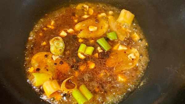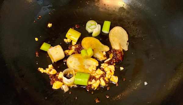 鍋裡倒油,放入生薑,蔥,蒜,炸香,放入一些火鍋底料翻炒。